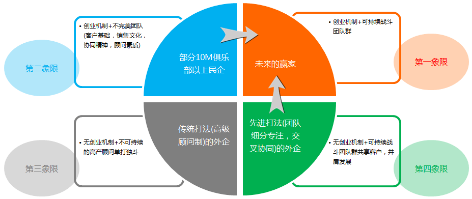 第二象限由本土系代表,他們要學(xué)的是系統(tǒng)化管理;第四象限由英國(guó)系代表,他們要做的是激發(fā)團(tuán)隊(duì)的創(chuàng)業(yè)精神;第三象限的公司比較傳統(tǒng),其實(shí)挺難改的。而未來是屬于可以進(jìn)入第一象限的公司的。